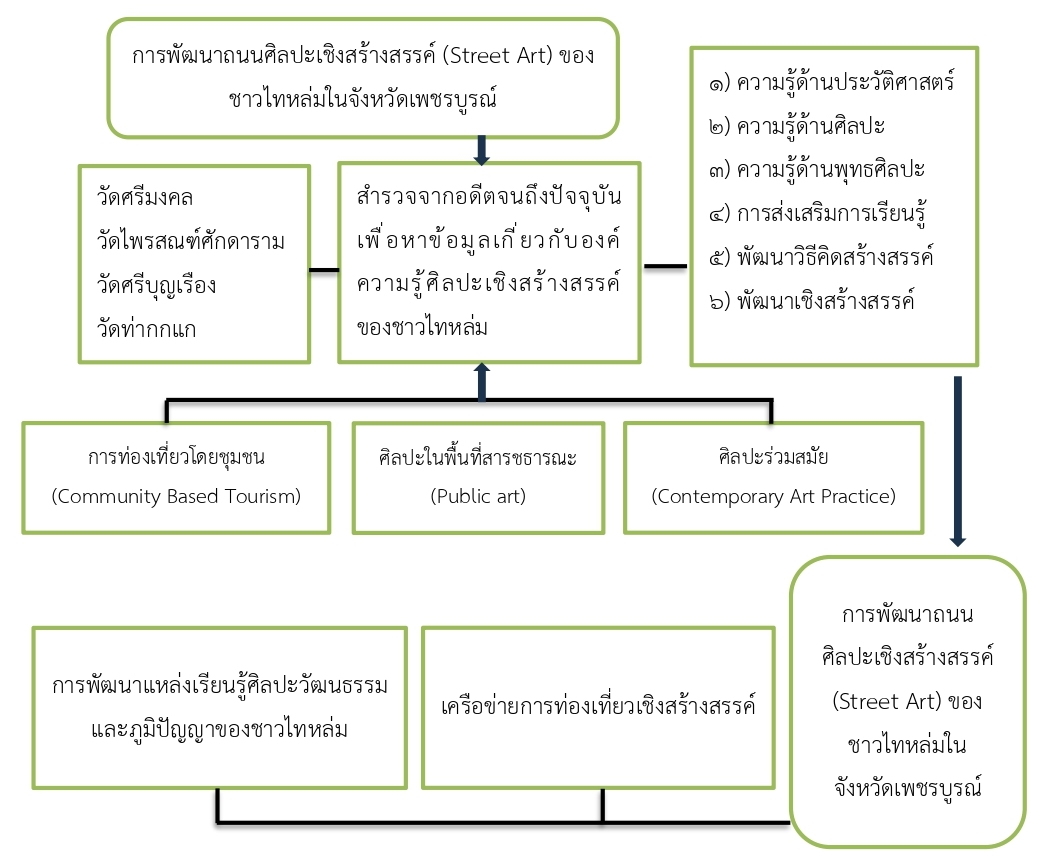 ๓) เพื่อการพัฒนาถนนศิลปะเชิงสร้างสรรค์ (Street Art) ของชาวไทหล่มในจังหวัดเพชรบูรณ์ การระดมกลุ่มและเครือข่ายต่าง ๆ ในการพัฒนาพื้นที่ ได้แก่ องค์การบริหารส่วนจัวหวัดเพชรบูรณ์ สภาวัฒนธรรมจังหวัดเพชรบูรณ์ กลุ่มสื่อประชาสัมพันธ์จังหวัดเพชรบูรณ์ กลุ่มการท่องเที่ยววัด และกลุ่มศิลปินจังหวัดเพชรบูรณ์ ด้วยการ ๑) พัฒนาบทบาทของเครือข่ายและการมีส่วนร่วมเครือข่ายถนนศิลปะเชิงสร้างสรรค์ (Street Art) บนถนนวัฒนธรรมเพื่อการท่องเที่ยวชุมชนไทหล่มของจังหวัดเพชรบูรณ์ ๒) การพัฒนาระบบฐานข้อมูลอิเล็กทรอนิกส์เพื่อส่งเสริมการเรียนรู้และการพัฒนาเครือข่ายพัฒนาศิลปะเชิงสร้างสรรค์บนถนนวัฒนธรรมเพื่อการท่องเที่ยวชุมชนหล่มสัก ๓) การพัฒนาระบบการให้บริการและการพัฒนาสินค้าชุมชนเครือข่ายการพัฒนาศิลปะเชิงสร้างสรรค์ บนถนนวัฒนธรรมเพื่อการท่องเที่ยวชุมชนไทหล่ม ๔) การผลักดันนโยบาย และยุทธศาสตร์การเสริมสร้างเครือข่ายการพัฒนาศิลปะเชิงสร้างสรรค์บนถนนวัฒนธรรมเพื่อการท่องเที่ยวชุมชนไทหล่ม