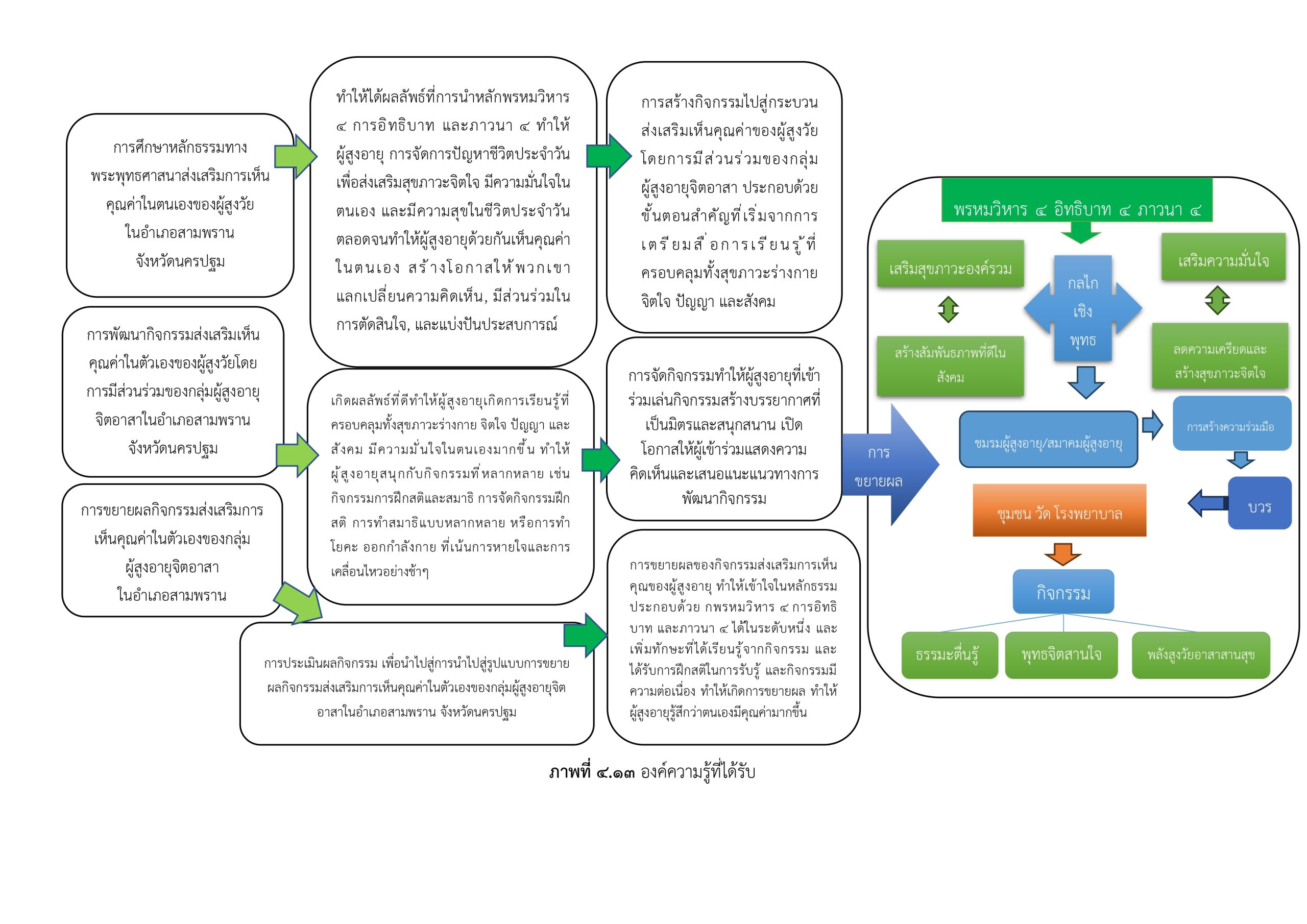องค์ความรู้ที่ได้รับจากรายงานวิจัยเรื่อง “กลไกเชิงพุทธบูรณาการเพื่อส่งเสริมการเห็นคุณค่าในตัวเองของกลุ่มผู้สูงอายุจิตอาสาในอำเภอสามพราน จังหวัดนครปฐม” การศึกษาครั้งนี้มุ่งนำหลักธรรมทางพระพุทธศาสนามาเป็นแนวทางพัฒนาคุณภาพชีวิตและจิตใจของผู้สูงอายุ โดยเฉพาะการสร้างความมั่นใจและการเห็นคุณค่าในตนเอง ผ่านกระบวนการเรียนรู้และกิจกรรมแบบมีส่วนร่วมของผู้สูงอายุจิตอาสาในชุมชน เพื่อให้เกิดสุขภาวะองค์รวม ทั้งด้านกาย จิตใจ ปัญญา และสังคม